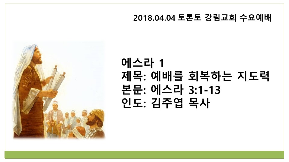2018.04.04 토론토 강림교회 수요예배 / 에스라 1 / 김주엽 목사